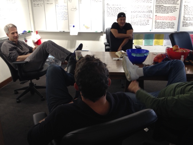 The dudes, deep in thought inside the BONES writers’ room.